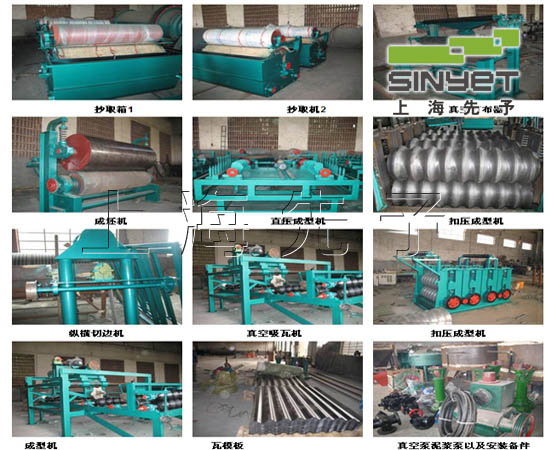 工藝一、抄取機。作用:把原漿中的水份分離并同時把漿料送到打布器脫水,然后成坯; 二、打布器。作用:用于漿料再次脫去多余水份,同時把脫料后毛布表面的雜質(zhì)清洗掉; 三、成坯機。作用:把從成坯機上脫下來的毛坯瓦送至直壓機; 四、接坯機。作用:把從成坯機上脫下來的毛坯瓦送至直壓機; 五、直壓機。作用:把石棉瓦毛坯壓制成型; 六、扣壓機。作用:把壓制成型后的石棉瓦加壓成型; 七、切邊機。作用:要據(jù)客戶需求把成型后的瓦毛邊切去; 八、吸瓦機。作用:把制作后的瓦堆起來; 九、攪拌機。作用:把按比例配好的原料加水后充分攪拌; 十、風(fēng)機。作用:和吸瓦機配合,給吸瓦機提供氣流; 十一、真空機。作用:和打布 器配合吸干毛布中的水份; 十二、氣水分離。作用:分離水的容器; 十三、輸送機。作用:運輸石棉瓦用長度可制定。